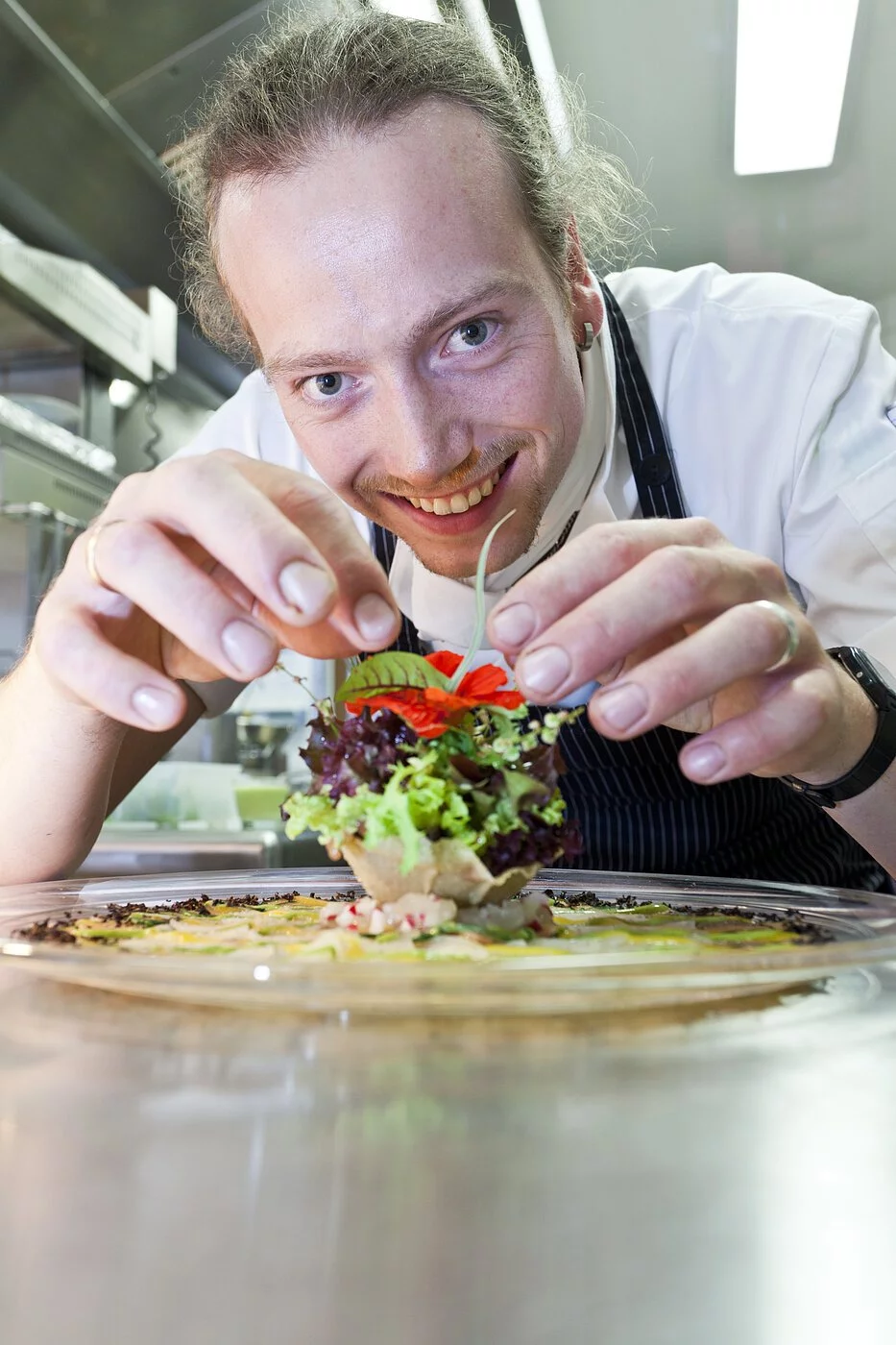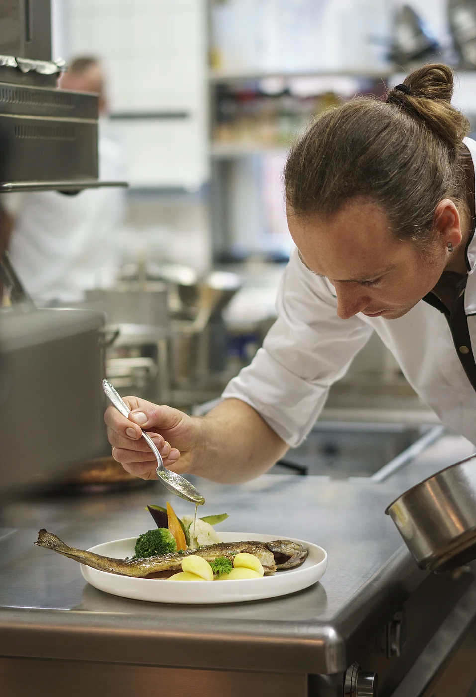 Ein Koch in einer Küche verfeinert ein Fischgericht auf einem Teller mit einer Soße.