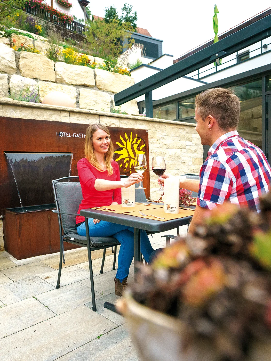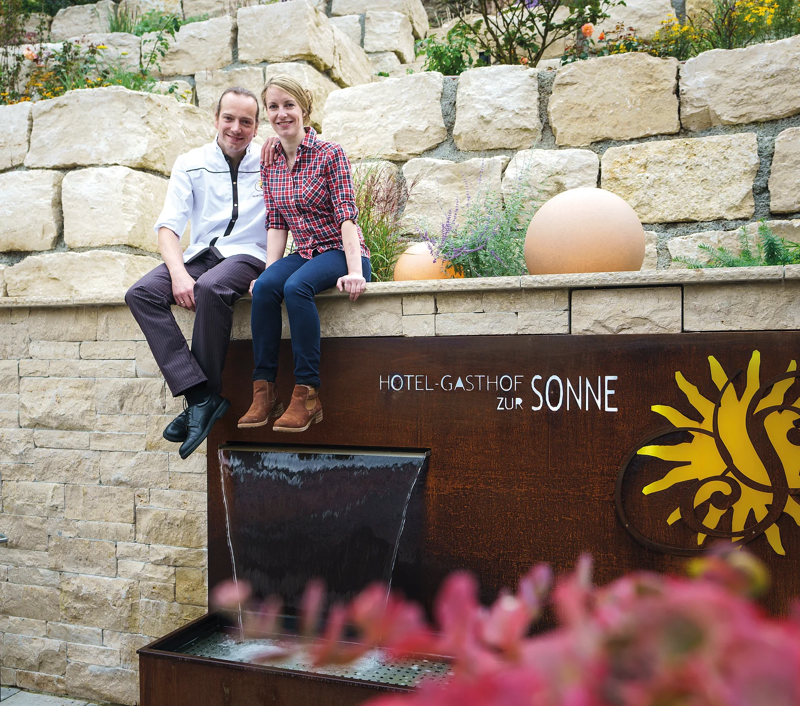 Nahaufnahme einer gebackenen Schweinshaxe mit Knödel und Soße.Zwei Personen sitzen an einem Tisch im Freien, stoßen mit Weingläsern an, im Hintergrund eine Steinmauer.Ein junger Koch mit schwarzer Schürze und weißem Hemd lächelt in die Kamera. er dekoriert ein Tatar mit grünem Salat und einer Blume.Zwei Personen sitzen auf einer Steinmauer neben einem Schild mit der Aufschrift "Hotel-Gasthof zur Sonne".