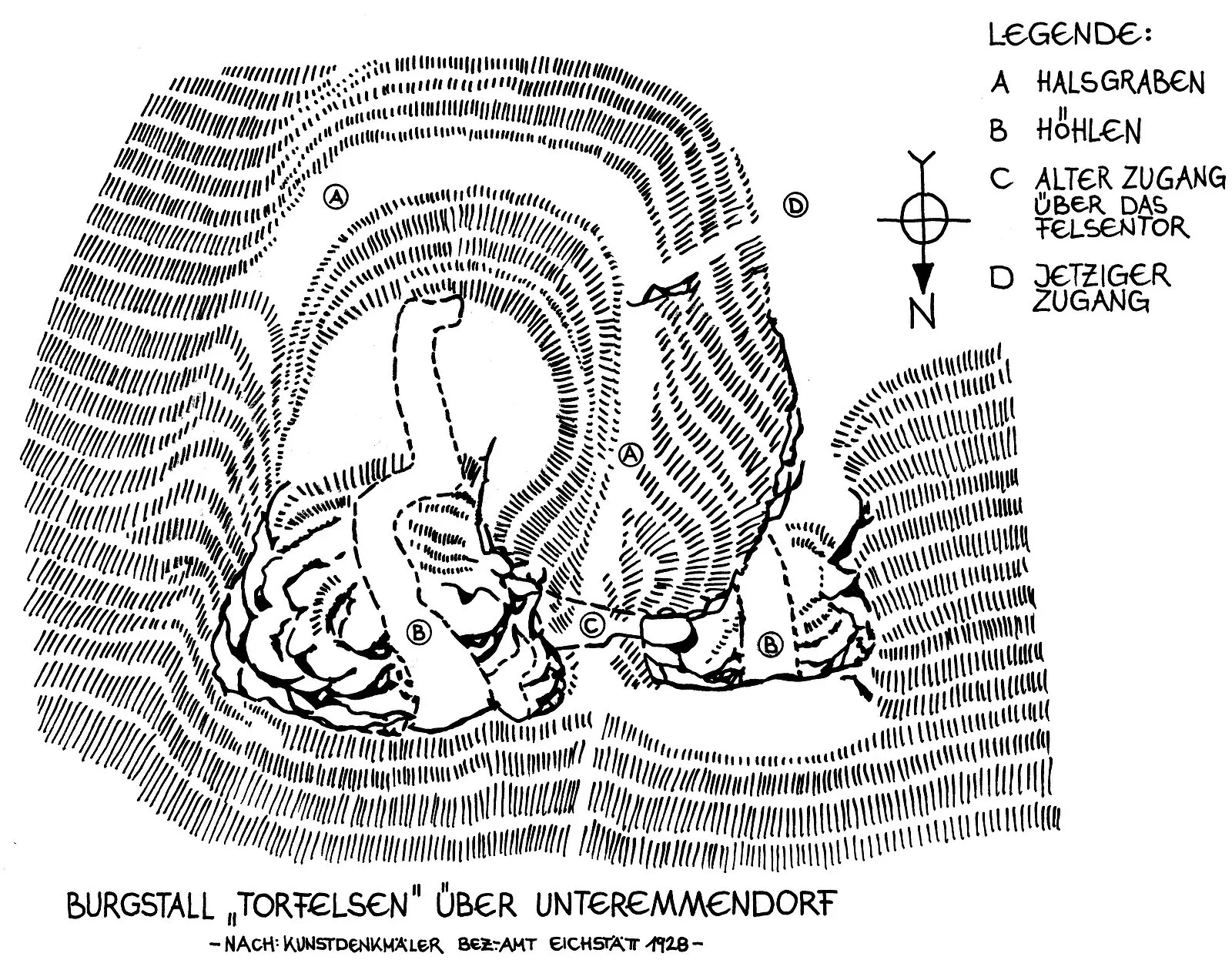 Die älteste war sicher die mittlere, der „Torfelsen“. Der alte Burgzugang führte vermutlich über das natürlich gewachsene Felsentor. Eine 25 Meter tiefe, begehbare Höhle im Felsen unter diesem Burgstall war wohl in die Burganlage einbezogen, ebenso eine weitere Höhle 15 Meter weiter westlich.