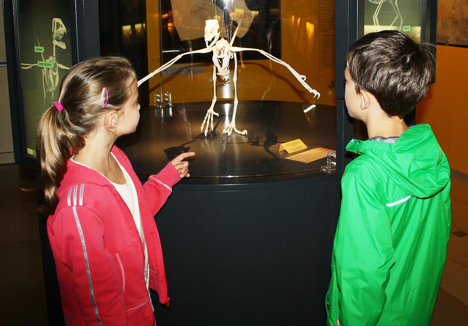Fossil eines kleinen Dinosauriers mit langem Schwanz und geöffnetem Maul in einem Stein eingebettet.Museumsleiter Dr. Martin Röper vor der Fischewand im Museum, die lauter versteinerte Fische zeigt.Zwei Kinder betrachten ein Skelett eines geflügelten Dinosauriers in einer Museumsvitrine.