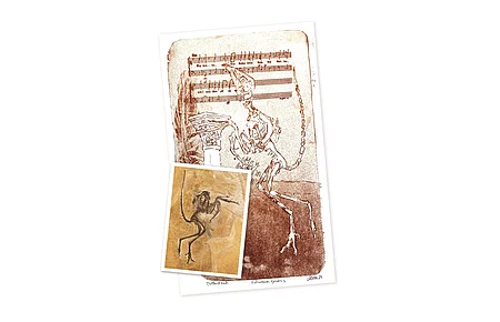 Ein großes Fossil eines kleinen Srvogels. Daneben das Modellskelett des Tiers zur Demonstration.
