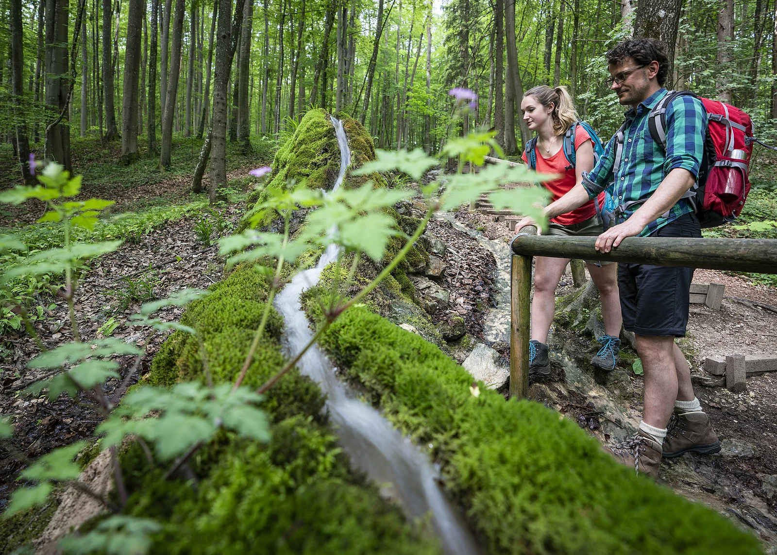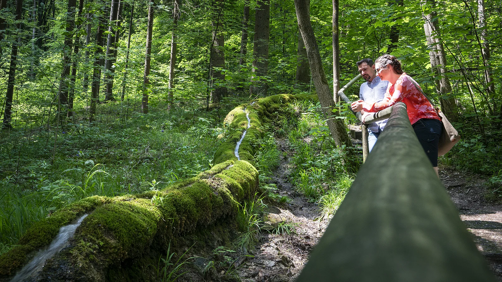 Zwei Personen lehnen an einem Geländer im Wald neben einem moosbedeckten Baumstamm mit Wasserfluss.Zwei Wanderer mit Rucksäcken beobachten einen mit Moos bewachsenen Wasserlauf im Wald.