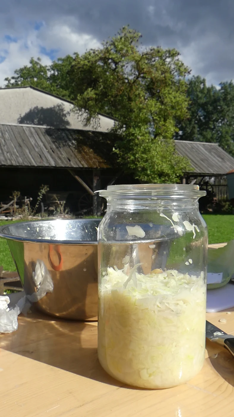 Auf einem Hof helfen alle mit, jeder soviel er kann, auch die Kinder! Vieles war früher einfach nur mühsam, aber manches macht auch richtig Spaß. Kraut einstampfen zum Beispiel. Habt Ihr noch nie gemacht? Dann wird es aber Zeit! Bitte mit sauberen Füßen und zwei Einmach-/Marmeladengläsern kommen!