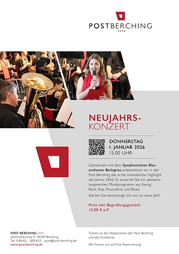 Gemeinsam mit dem Symphonischen Blasorchester Beilngries präsentieren wir in der Post Berching das erste musikalische Highlight des Jahres 2026. Es erwartet Sie ein abwechslungsreiches Musikprogramm aus Swing, Rock, Pop, Musicalhits und Blues. Starten Sie beschwingt mit uns ins neue Jahr!